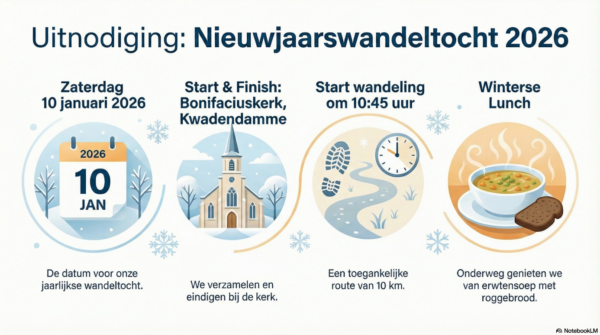 Het bestuur van Regio Zuidwest nodigt u van harte uit voor onze Nieuwjaarswandeltocht op zaterdag 10 januari 2026 om 10.00 uur.