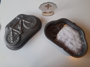 Je leest het goed: deze keer gaat het niet over een ideale fiets om de Pyreneeën mee over te komen, Het gaat hier om een bakblik in de vorm van een fiets. Daarmee kun je de lekkerste Tarta de Santiago ooit bakken. Wij van Jacobike willen immers dat de complete fietspelgrimage in passende stijl verloopt en hoe kunnen we dat beter doen met de Tarta de Santiago, de kenmerkende amandeltaart van Santiago de Compostella, gepresenteerd in de vorm van een fiets.