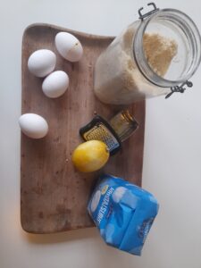 Recept: 200 gram suiker, 200 gram amandelmeel 4 eieren, citroenrasp van 1 citroen