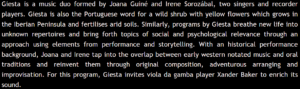 El camino se hace cantando Met trots presenteren wij in blok 4 een concert door Giesta Duo. Giesta is een duo dat zich richt op vroege westerse genoteerde muziek en mondelinge tradities uit mediterrane landen. Joana en Irene gebruiken hun stemmen, blokfluiten en traditionele percussie als instrumenten om deze repertoires te transformeren en opnieuw uit te vinden. Met een achtergrond in historische performance boren ze de overlap tussen deze tradities aan en deconstrueren deze door componeren en arrangeren, improvisatie en hedendaagse uitvoeringstechnieken.