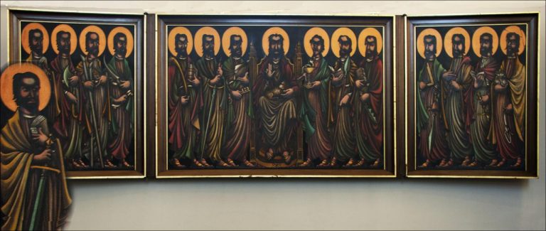 Op dit drieluik, tussen 1950 en 1954 geschilderd door Hendrik Wiegersma, zijn naast de Christusfiguur in het midden, 14 personen weergegeven. Jacobus Major staat