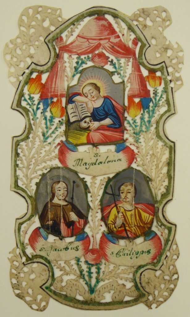 Op deze devotieprent staan de heiligen Magdalena (boven), Jacobus (links) en Philippus (rechts). Jacobus draagt een dun stokje met een schelp. Dit wijst op Jacobus de Meerdere, maar veelal wordt samen met Philippus juist Jacobus de Mindere bedoeld. Kortom mogelijk zijn hier de kenmerken van beide Jacobussen door elkaar gehaald.