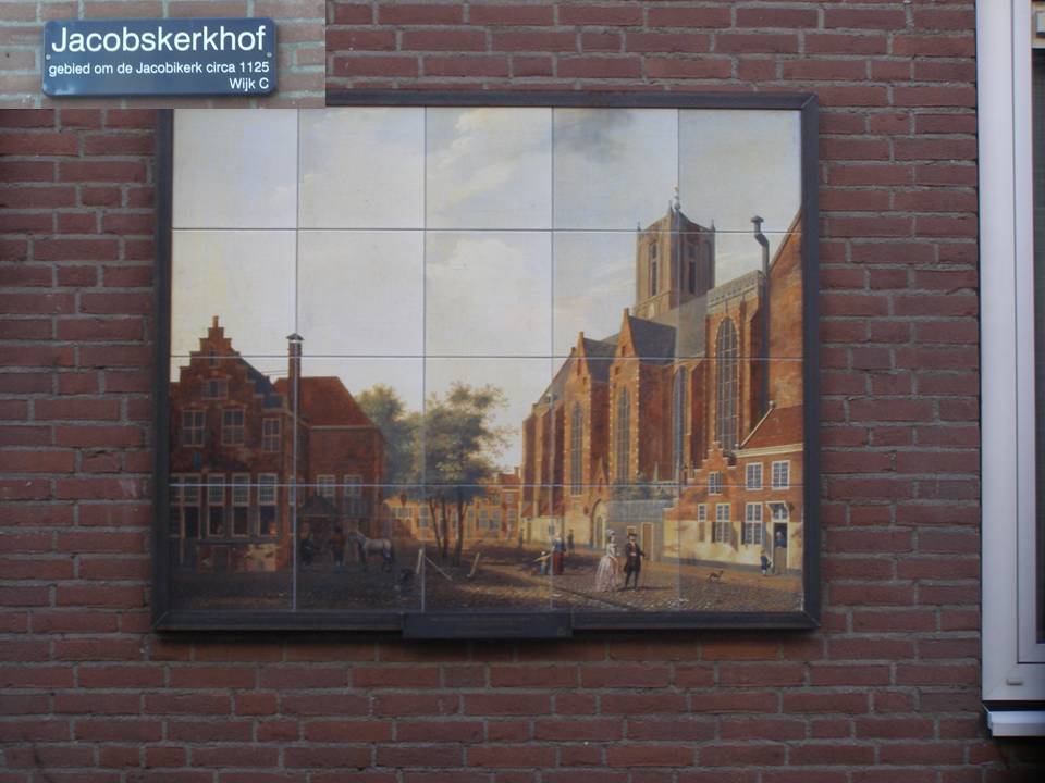 Tegen een gevel van een van de panden is een tegeltableau aangebracht voorstellende de Jacobikerk in vroeger jaren. Opvallend daarbij is het ontbreken van de huidige spitse toren. Een flink stuk inzoomen bij de torenspits laat zien dat indertijd een haan fungeerde als windvaan en niet een Jacobsschelp zoals tegenwoordig.
