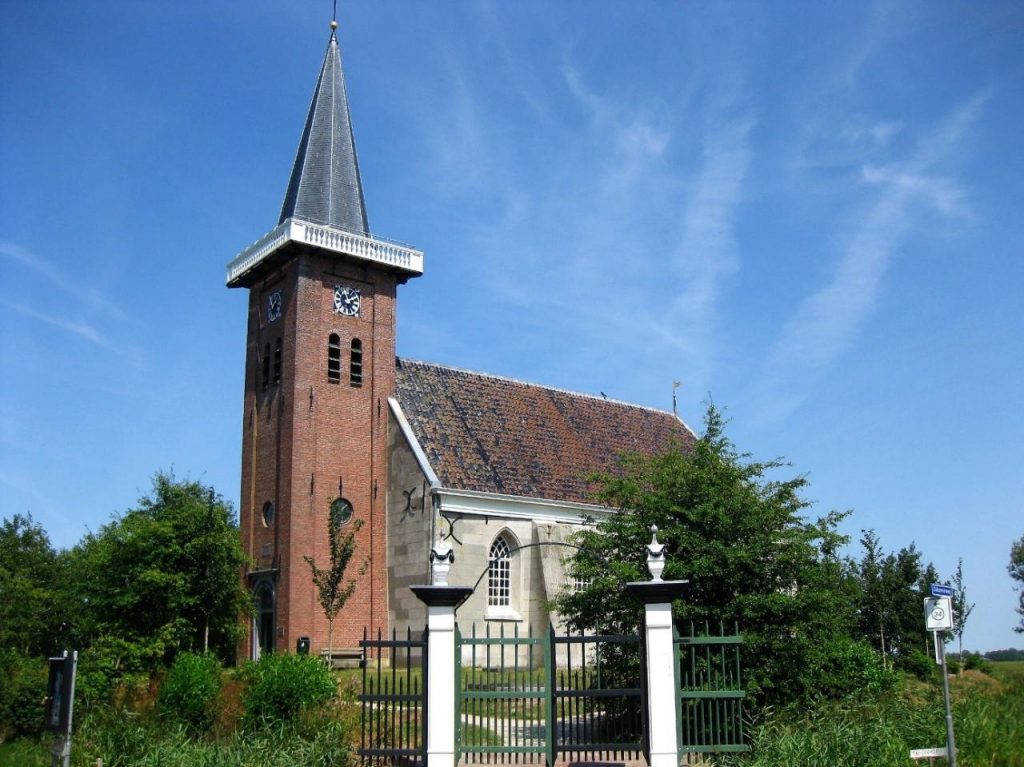 De kerk van Saaxumhuizen stamt uit de 13e eeuw. Door de 19eeeuwse pleisterlaag zijn de oude kloostermoppen van de muren niet meer zichtbaar.
