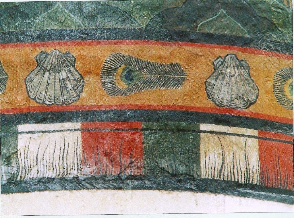 De tapijtschilderingen bij het Sint-Jacobsaltaar had oorspronkelijk een donkergele boord met de attributen van Jacobus de Meerdere: de schelp en de waterkruik.