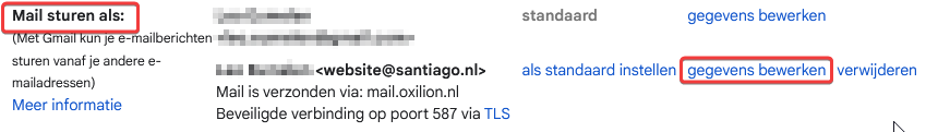 Ook de gegevens voor de uitgaande e-mail moeten worden aangepast. Ga daarvoor naar het kopje ‘Mail sturen als’ en klik bij het santiago-account op ‘gegevens bewerken’.