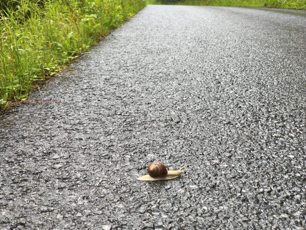 Onderweg naar Rome ergens in de zuidelijke Alpen, traag op weg naar de overkant. De slak als metafoor van mijn reis naar innerlijke vertraging.