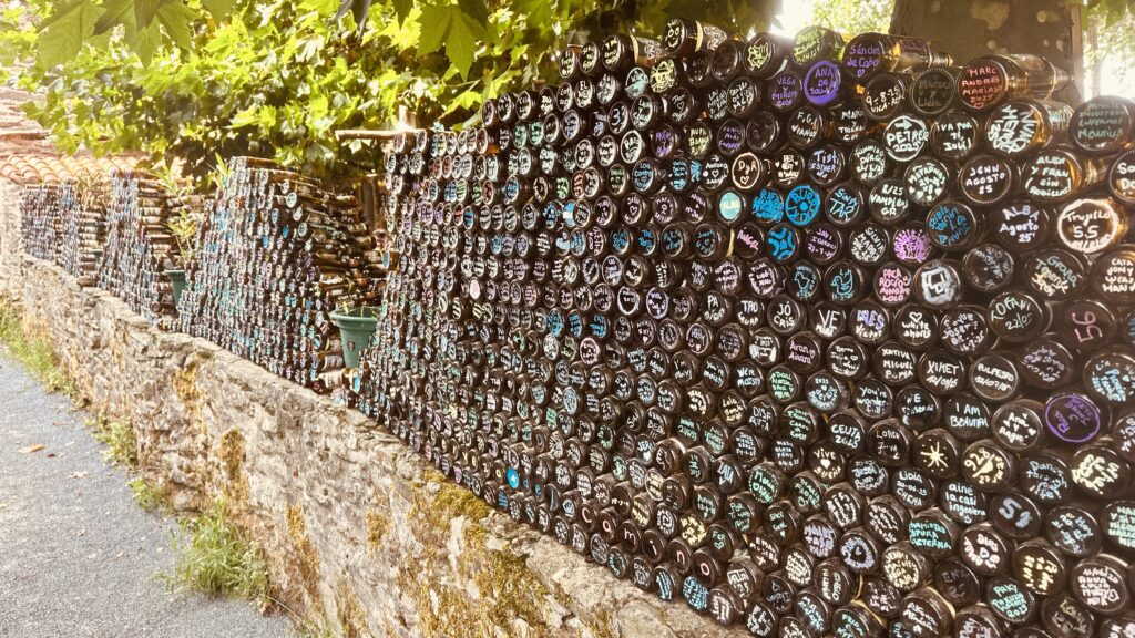 Flessenwand op weg naar O Pedrouzo. Pelgrims wordt gevraagd hún gedachten op de bodem te schrijven.